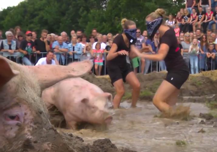 Op het Dicky Woodstock Popfestival en het Luttenbergsfeest moeten deelnemers geblinddoekt zo snel mogelijk een varken in een modderpoel aantikken.