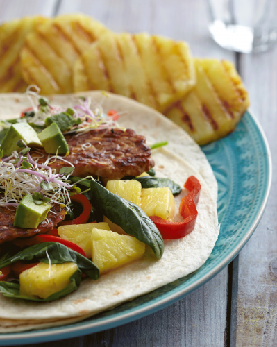 Verwarm de wraps 15 seconden in de magnetron of verwarm ze kort in een hete koekenpan. Leg ze daarna op een bord. Was de puntpaprika, verwijder de zaden en snijd in reepjes. Bak de paprika en de spinazie. Snijd de ananas in plakjes, voeg die bij de paprika en spinazie en bak 5 minuten mee op middelhoog vuur. Snijd ondertussen de tempeh in dunne plakjes en leg deze verspreid op de snijplank. Wrijf de tempeh goed in met sojasaus. Schep de gebakken groenten op de wraps en zet de koekenpan weer op het vuur. Leg de plakjes tempeh in de pan en bak beide kanten krokant. Voeg op het laatst de teriyakisaus toe en bak nog 1 tot 2 minuten. Verdeel de tempeh over de wraps en zet de koekenpan meteen onder water om te weken (aangekoekte teriyakisaus is lastig te verwijderen). Beleg beide wraps eventueel nog met avocado en kiemgroenten en vouw dan dicht. Serveer warm!