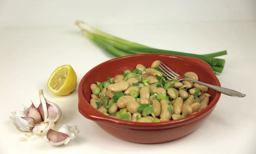 Dit recept is simpel en snel. Laat de bonen uitlekken, maar niet helemaal. Er blijft dus een beetje vocht achter. Snijd de knoflook in dunne plakjes. Meng nu alle ingrediënten en strooi er naar smaak wat zout en peper over. Klaar!