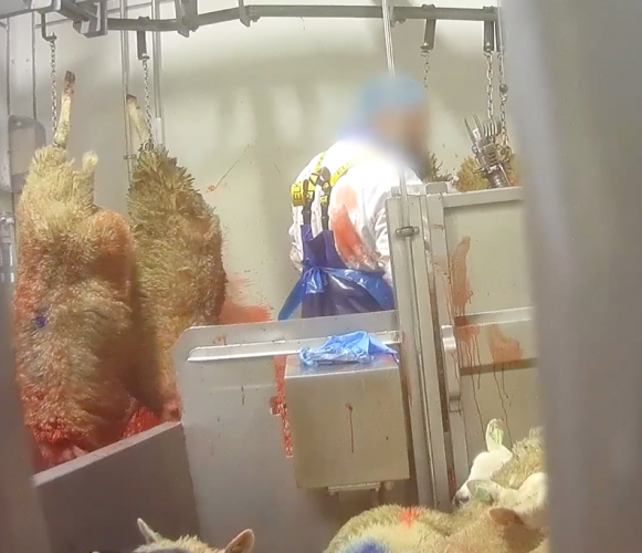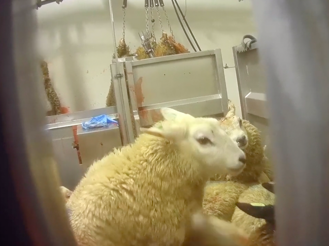 In tenminste één geval bedwelmt en keelt de slachter het ene schaap eerst, terwijl het dier ernaast, bij volle bewustzijn, op de rug liggend, daar getuige van is.