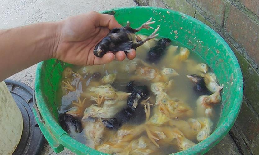 Kuikens die te klein zijn of afwijkingen vertonen zijn waardeloos voor de sector en worden afgemaakt in de broeierij. Hun nek wordt gebroken op de rand van een krat, of ze worden verdronken in een emmer water. Een aantal kuikentjes blijft achter in de kratten met lege eierschalen. Deze dieren belanden in de afvalcontainer waar ze sterven door gebrek aan voedsel en zorg.