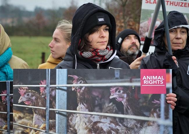 Zaterdagmiddag 12 januari kwamen zo’n 100 demonstranten bijeen voor de demonstratie van Animal Rights voor de poort van de dubbele megastal in Merksplas. Onlangs bracht de dierenrechtenorganisatie nog trieste beelden naar buiten van de leefcondities van de kooikippen. Campagnecoördinator Els van Campenhout: “Met onze acties vragen we aandacht voor het lijden van leghennen. We willen zo spoedig mogelijk een verbod op deze horror-schuren.”