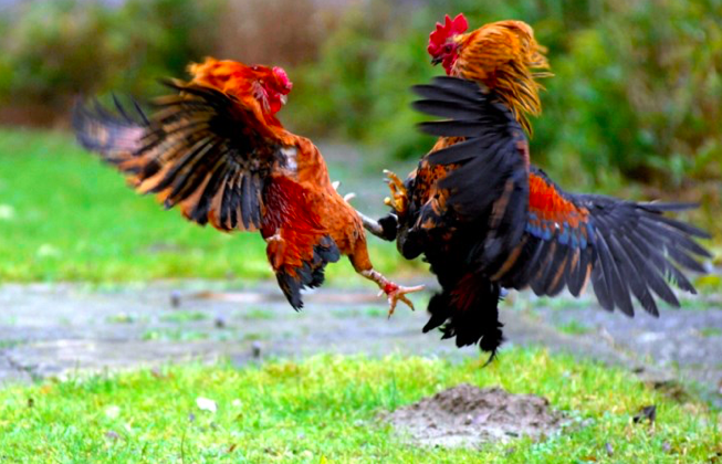 Bij hanengevechten vechten hanen tot de dood in een arena. Dit is een staaltje van middeleeuwse, verschrikkelijke dierenmishandeling.