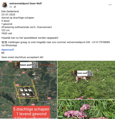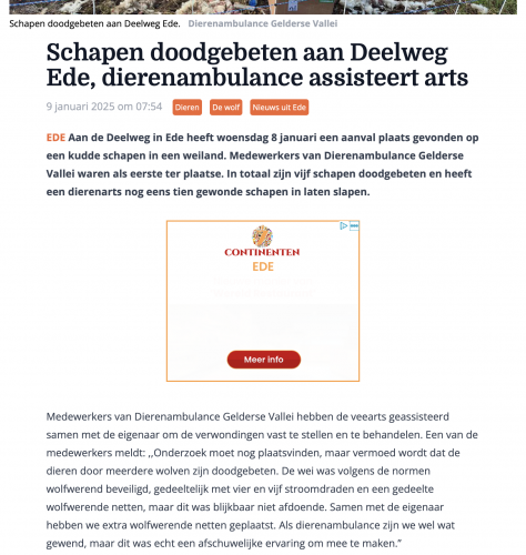 ”De wolvenaanval vond plaats in Ede, op 8 januari. Daarbij werden vijftien schapen gedood. Die zouden achter wolfwerende hekken hebben gestaan, schrijven BBB en SGP in het verzoek tot het spoeddebat. Dat blijkt na onderzoek niet te kloppen.”
