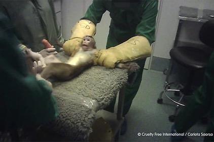 Op de video is te zien hoe jonge apen fysiek in bedwang worden gehouden, zonder verdoving om hun angst te verminderen; apen krijgen klappen op hun kop, er wordt aan hun vacht getrokken en ze worden vervloekt omdat ze tegenstribbelen. We zien konijnen worstelen in hun fixatieapparatuur, eruit vallen en ernstige verwondingen aan de ruggengraat oplopen.