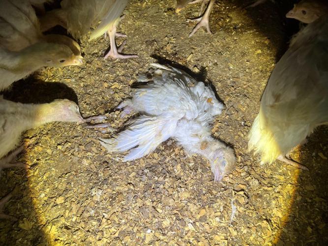 In addition, we also see how turkeys wade through the mud and sink into it up to their 'ankles'. The housing is below all standards. Carcasses that have clearly been in the barn for days are pushed into the dirty, muddy surface. The animals have to watch as their sick companions slowly perish and their deceased 'relatives' decay, teeming with maggots.