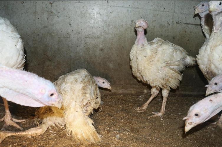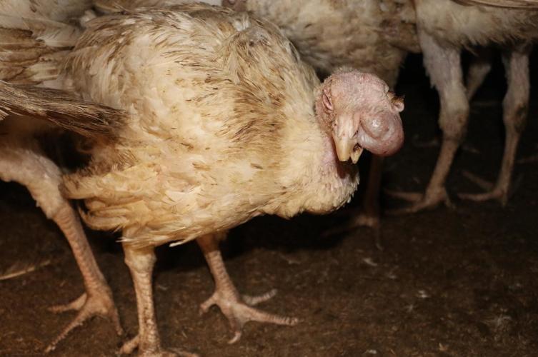 In the footage we see how a turkey with a tumor the size of a ping pong ball on its' head and severely deformed toes stumbles through the barn. There is also a turkey with a giant, sagging tumor on the chest. We see a gaping, bleeding wound on yet another animal. The animals with painfully deformed toes and legs, leg growths or animals that simply cannot stand on their legs cannot be counted. There are no signs of medical care to be seen.