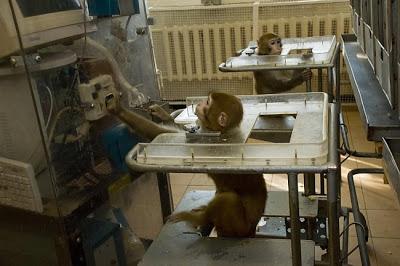 Aan de Italiaanse universiteit van Parma werden twee resusapen en 1 lampongaap (macaca menestrina), een bedreigde diersoort, urenlang gedwongen te grijpen naar een object.2