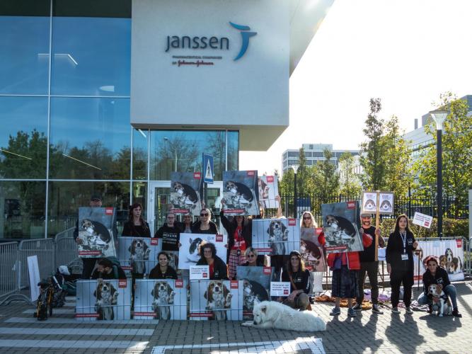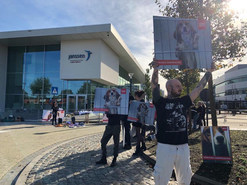 Een twintigtal actievoerders van Animal Rights hield woensdagmiddag twee uur lang een vreedzaam protest tegen dierproeven aan de ingang van Janssen. Ze toonden spandoeken tegen dierproeven en namen zelf enkele honden mee. De actievoerders legden ook bloemen neer als eerbetoon aan alle proefdieren.