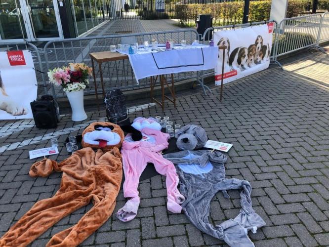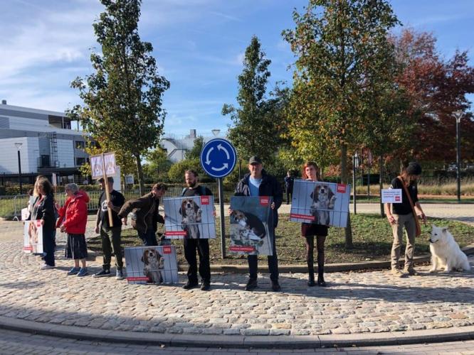 Animal Rights voerde woensdag 26 oktober actie tegen dierproeven bij Janssen Pharmaceutica in Beerse.1 Een 20-tal actievoerders op 2 benen en 4 poten lieten hun stem horen voor de honden, mini-pigs, konijnen, cavia’s, ratten en muizen die bij Janssen opgesloten zitten, de 1 miljoen proefdieren in België, de 10 miljoen proefdieren in Europa en de 200 miljoen proefdieren wereldwijd!