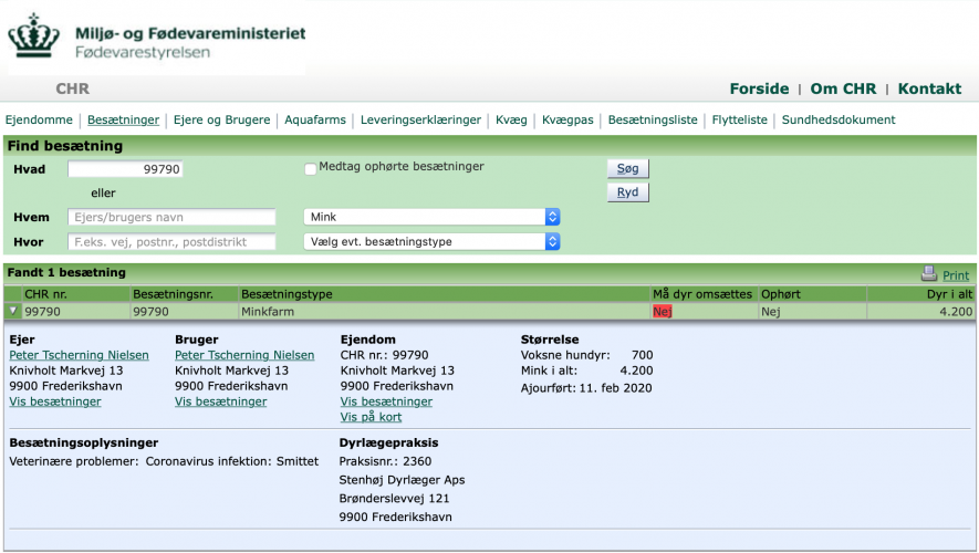 De nertsenfokkerij is van Peter Nielsen en ligt aan de Knivholt Markvej 13 in Frederikshavn. Zijn vrouw maakt schoon in het verzorgingstehuis Vendelbo Centrum in Sindal waar zowel bewoners als werknemers besmet bleken met corona. Nielsen, zijn vrouw en volwassen zoon testten allen positief. Het bedrijf heeft een vergunning voor 700 moederdieren en 4200 nertsen in totaal.