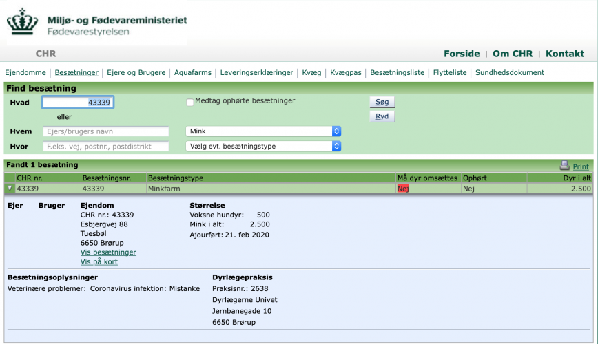 De Deense veterinaire en voedseladministratie (Fødevarestyrelsen) nam vervolgens samples bij 34 nertsen op het bedrijf en analyseerde deze in het Statens Serum Institut (SSI). Op 17 juni bleek dat het coronavirus in monsters van de nertsen aanwezig was.