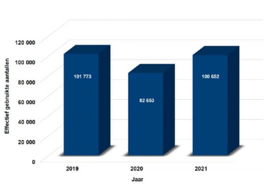 Nadien werd het proefdieronderzoek traag en gefaseerd terug opgestart. Deze herstart was volledig tegen eind 2020. Dit verklaart dat de aantallen gebruikte proefdieren in 2021 vergelijkbaar zijn met deze genoteerd vóór de COVID-19 pandemie.