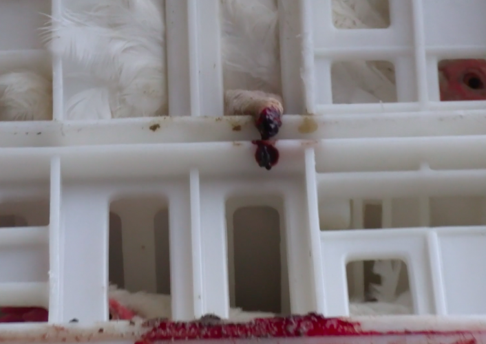 We leefden al die tijd op onze eigen uitwerpselen, want onze stal werd nooit gepoetst. De ammoniak uit onze mest brandde onze borstveren gedeeltelijk weg. De lucht in de stal was zo vervuild door het stof dat uit onze veren en verdroogde uitwerpselen komt, dat elke hap naar lucht onze keel vol stof deed zitten. Sommigen van ons stierven al een vroegtijdige dood in de stallen, omdat we geen individuele medische verzorging kregen.
