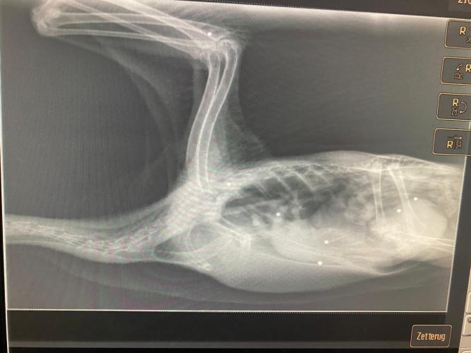 Appeltje wordt meegenomen naar de dierenarts, waar er röntgenfoto’s van hem worden gemaakt. De redders van Appeltje en de dierenarts schrikken wanneer ze tot de ontdekking komen dat er maar liefst 7 kogeltjes in zijn kleine lijfje zitten. Hij was doorzeefd met hagel, maar had het overleefd.