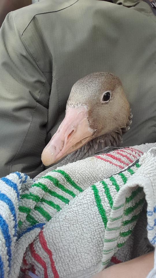“Ik zag de gans heel snel op de weg lopen, alsof hij ergens moest zijn. Dat is ongebruikelijk gedrag voor een gans, dus ik reed terug en zette de auto stil langs de weg. Zodra de gans mij zag begon hij nog harder te rennen. Toen wist ik zeker dat er iets niet klopte,” aldus de vinder van de gans.