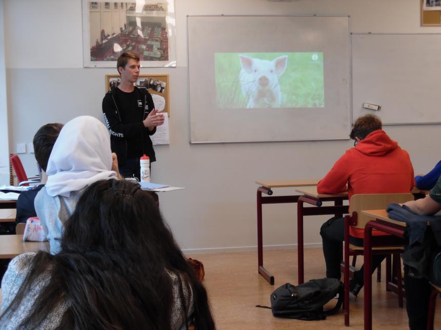 Animal Rights geeft regelmatig gastlessen. Vanuit de Plant Power campagne geven we voorlichting over plantaardig eten, maar we vertellen we ook over de impact van wat je eet op dieren en op het milieu. Daarnaast geven we gastlessen waarin we onze visie op de wereld geven en wat wij doen om onze visie zo snel mogelijk realiteit te laten worden. Deze week gaven we gastlessen op een middelbare school in Leiden bij het vak maatschappijleer, waarin we leerlingen hebben laten nadenken over het leed van dieren en welke actie gerechtvaardigd is om dit leed te stoppen.