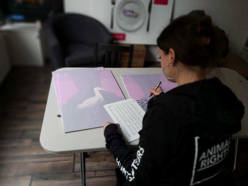 Teamleden van Animal Rights schrijven de namen van alle deelnemers van de actie 'Eendjes van de kaart' op.