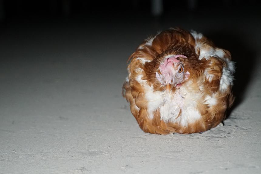 Zonder de tienduizenden kakelende hennen en het mechanisch gemaal van de ventilatie kwam de kille, industriële atmosfeer nog harder aan bij het onderzoeksteam. Tussen de lege stellingen zaten her en der nog hennen - veelal in elkaar gedoken - die ontsnapt waren aan de kippenvangers. Nu, zonder voedsel en drinken, dwaalden ze rond door de verder lege schuur als laatste overlevenden met shellshock op een verder verlaten slachtveld.