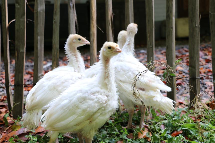 De geredde kalkoenkuikens ontdekken hun nieuwe wereld stapje voor stapje. Hun blauwe oogjes scannen de omgeving terwijl ze voor het eerst buiten komen, over de herfstblaadjes wandelen en die onder hun pootjes horen knisperen. Frisse buitenlucht vult voor de eerste keer hun longen. Warm zonlicht op hun hoofdje. Kalkoenen in de vleesindustrie krijgen nooit de kans om dit te ervaren: zij blijven hun hele leven lang opgesloten in schimmige stallen zonder frisse lucht en zonlicht.