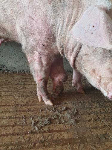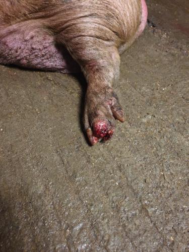 “4 zeugen mank 3 poten, geen steunname en pathologisch letsel. Klopnr FR33VHY en FR29NU1 [Franse varkens]. Geslachtsrijpe beer niet gescheiden van zeugen in de wachtruimte, samen gelost. 1 zeug exungulatie [loslaten de klauw aan de basis].”