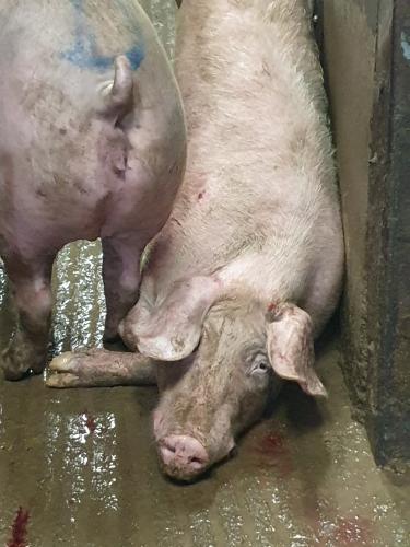 “Voor aanvang slacht 1 zeug welke niet zelfstandig kan lopen, deze ligt tussen de mestvarkens in de wachtruimte en heeft over het gehele lichaam huidletsels tgv trauma (bijten, trappen).”