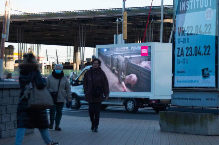 De rijdende bestelwagen met ledwagen reed vier uur lang door het epicentrum van de varkensindustrie om de vreselijke undercoverbeelden opnieuw onder de aandacht te brengen. De uiterst schokkende beelden tonen hoe varkens frequent geschopt en geslagen worden door transporteurs en medewerkers bij aankomst in het slachthuis te Tielt. Kreupele varkens werden hardhandig aan de oren voortgetrokken. Een varken dat niet in staat was te lopen werd met kettingen rond de poten uit een vrachtwagen gesleept. Daarbovenop zagen we hoe varkens bij bewustzijn gekeeld werden en hoe een varken levend in het broeibad terecht kwam en verdronk in het hete water.