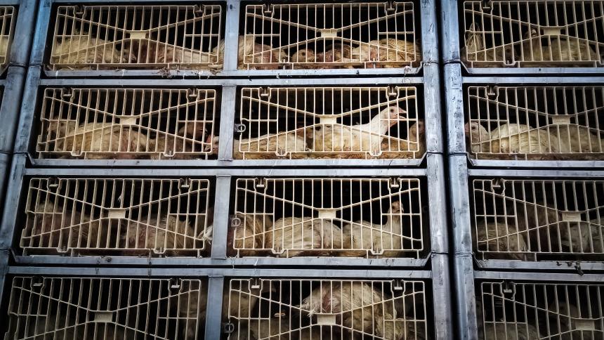 In België werden alleen al in 2023 maar liefst 300 miljoen kippen geslacht. 1 Het grote merendeel van deze kippen in de cijfers zijn ‘vleeskuikens’. Deze dieren zijn slechts zes weken oud en dus nog kuikens wanneer ze naar het slachthuis afgevoerd worden. De versneden lichaamsdelen van deze kuikens liggen in de supermarkten verpakt als reguliere 'kip'.