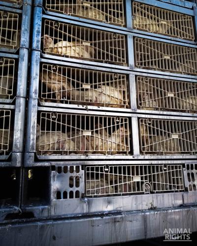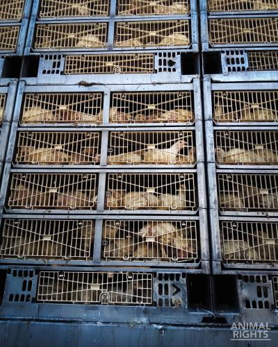 Animal Rights publiceert nu foto’s van 6 weken oude kuikens die op maandag 12 augustus 2024 gespot werden op de Antwerpse Ring richting Gent. De kuikens zitten met wijd open snavels wanhopig te snakken naar adem terwijl ze gevangen zitten in bloedhete metalen trailers, op weg naar een afgrijselijke dood in het slachthuis.