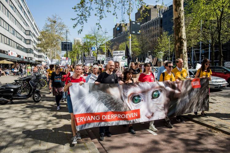 Animal Rights en Een DIER Een VRIEND houden zaterdag 7 september 2019 een mars richting het apentestcentrum BPRC. De dierenrechtenorganisaties werken samen aan sluiting van het proefdiercentrum en eisen een goed pensioen voor de opgesloten apen. Er worden 200 actievoerders in Rijswijk verwacht.