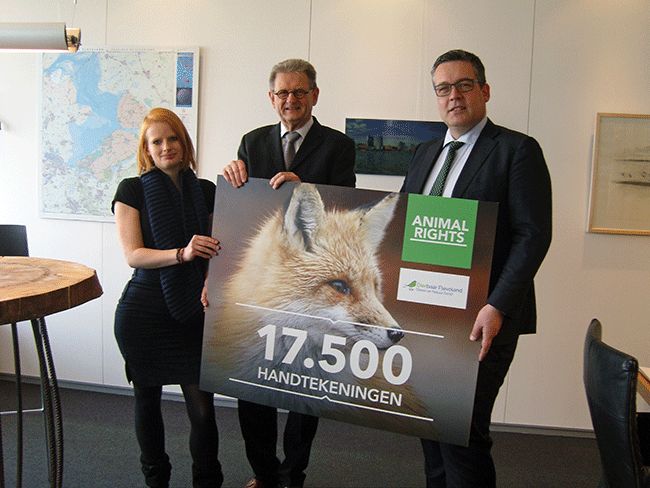 Animal Rights en Dierbaar Flevoland overhandigden afgelopen maandag 17.500 handtekeningen aan de provincie Flevoland tegen de nachtelijke vossenjacht. Jessica Smit, campagnemedewerker van Animal Rights: “Wij willen af van het plan om vossen te schieten in het holst van de nacht.”