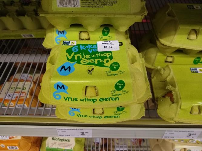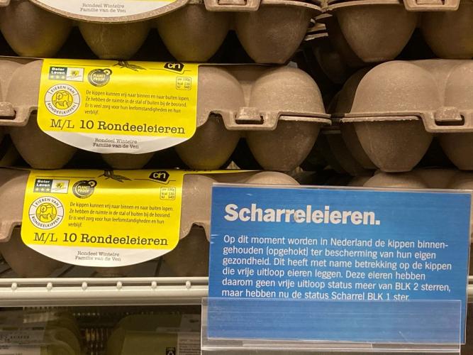 Eieren van opgehokte vrije-uitloophennen moeten vanaf vrijdag 12 februari 2021 in Nederland gestempeld worden als scharrelei (eicode 2 in plaats van eicode 1). Nu de 16 weken termijn is verlopen, worden deze eieren beschouwd als scharrelei en worden ze verpakt in een regulier scharreldoosje met 1 ster Beter Leven-keurmerk. De doosjes krijgen de tekst: “Scharreleieren. Deze hennen worden tijdelijk binnen gehouden (opgehokt) ter bescherming van hun eigen gezondheid, de eieren heten daarom tijdelijk scharrelei in plaats van vrije-uitloopei. De hennen hebben nog wel toegang tot de overdekte buitenuitloop (veranda).”