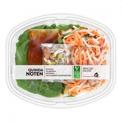De AH to go heeft een ruim aanbod aan plantaardige opties, onder andere aan salades: couscousvruchtensalade met sinaasappelgemberdressing, spinazie quinoa-noten-salade met sesamdressing en falafelcousoussalade met granaatappel-vinaigrette.