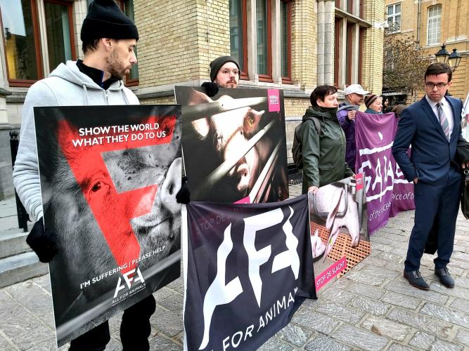 Tijdens de zitting vond er voor de deuren van het gerechtsgebouw een stille en vreedzame demonstratie plaats om aandacht te vragen voor de rechtszaak. De demonstratie op de Grote Markt trok veel aandacht van voorbijgangers, mede door de beelden die getoond werden van de undercover reportage. 1