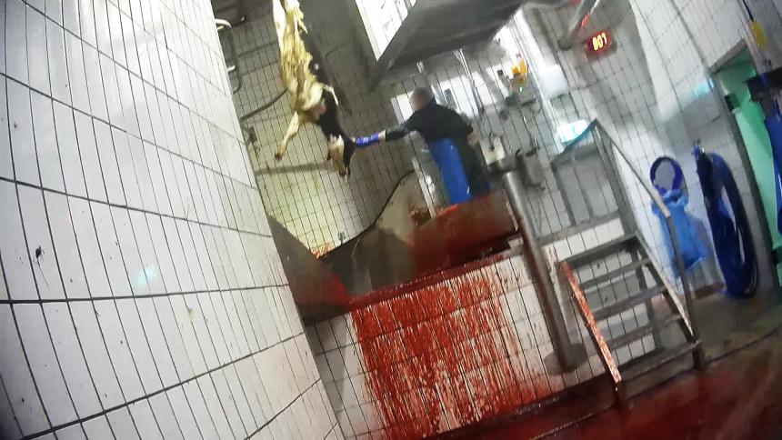 In de eerste video zien we hoe een kalfje door het slachthuis loopt, wordt opgehangen en naar de slacht wordt geleid. Op de andere video horen we een medewerker van het slachthuis vertellen dat er, wanneer er twee kalfjes tegelijk in de fixatiebox terechtkomen, verkeerd wordt geschoten. Het dier krijgt de pen 'vol op z'n neus' en 'door z'n neus gejaagd'.