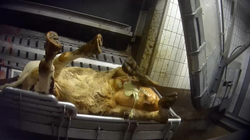 In de volgende video is te zien hoe een koe in de zogenaamde immobilisatiebak nog steeds melk produceert. We zien hoe de moedermelk uit de uier van de koe gutst terwijl ze al hersendood is en nog maar enkele ogenblikken is verwijderd van de slacht. De beelden tonen de keiharde realiteit achter de zuivelindustrie: koeien zijn niets meer dan gebruiksvoorwerpen geworden die worden afgedankt wanneer de 'veehouder' dat wil.
