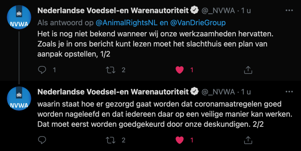 Begin mei, toen Animal Rights de eerste versie van dit artikel publiceerde, zegt de helft van de dierenartsen in een interne enquête dat ze regelmatig geen anderhalve meter afstand kunnen houden. Twee derde stelt dat afstand houden in de vleessector onmogelijk is. Toch antwoordt minister Carola Schouten van Landbouw op Kamervragen: "uit navraag bij de NVWA bleek niet dat de RIVM-richtlijnen op grote schaal niet worden nageleefd".