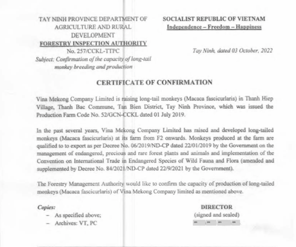Het Vietnamese CITES (de Convention on International Trade in Endangered Species of Wild Fauna and Flora) bureau heeft hiervoor op 28 oktober 2022 een vergunning afgegeven die geldig is tot 26 april 2023 (CITES VNMK 02112022 / 224009S). Het gaat om 320 mannetjes en 160 vrouwtjes.