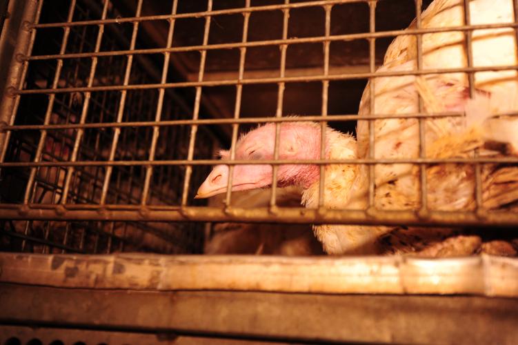 De dieren lopen niet gelukkig rond in een weide. Ze leven in stallen met kunstlicht, zijn vaak vuil, hebben wonden en voelen de buitenlucht alleen wanneer ze naar het slachthuis vervoerd worden.