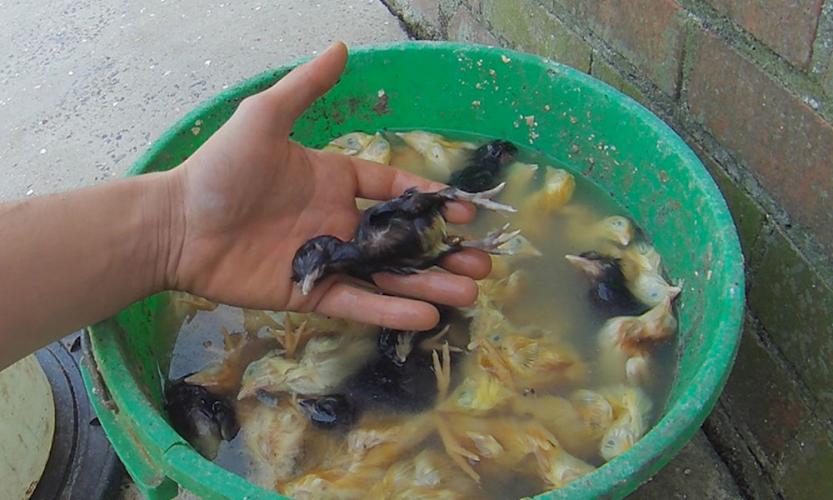 Nadat de dieren gesorteerd waren werden de kratten met lege eierschalen geledigd. Tussen die lege eierschalen zaten er echter nog kuikentjes verscholen, die later dan hun soortgenoten ter wereld waren gekomen en waardoor ze als zwakker en bijgevolg als afval werden beschouwd. Soms haalde men de diertjes van tussen de eierschalen, waarna ze in een emmer met water werden verdronken.