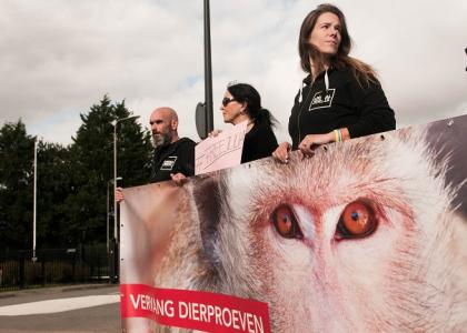 Animal Rights en Een DIER Een VRIEND voeren actie voor de vrijheid van penseelaapje Julia uit het apentestcentrum BPRC.