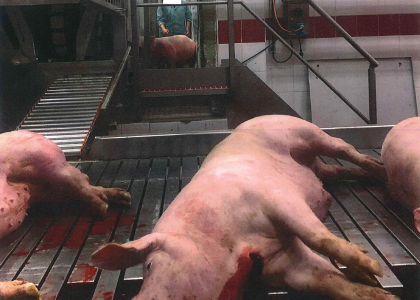 Dossier misstanden bij Vlaamse slachthuizen. Bij Westvlees worden varkens die weigeren naar hun executie te lopen, aan de poten en oren voortgetrokken en kunnen ze ook nog van een trap afvallen.