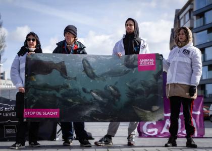 Woensdag 15 maart 2023 organiseerden Animal Rights en Bite Back een demonstratie tegen de komst van de grootste zalmkwekerij van Europa in Oostende.