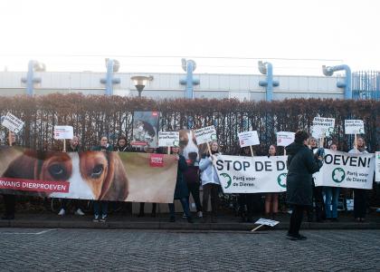 Animal Rights demonstreerde op woensdag 11 januari voor de poorten van proefdierbedrijf Charles River in Den Bosch.