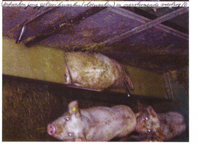 In een veterinaire verklaring wordt geschreven: “In een aantal afdelingen zien wij dat jonge vleesvarkens (< 30 kg lichaamsgewicht) in de vollopende en overstromende voerbakken gingen staan en spelen met als gevolg dat tenminste 4 biggen klem kwamen te zitten onder metalen strips die uit het model geraken van de voerbakken moesten verhinderen en daarbij in de volgelopen voerbakken verdronken.”