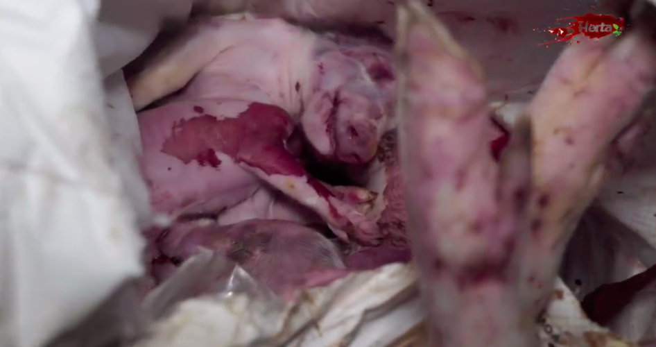 Een ongewenste big wordt doodgeslagen tegen een afscheiding. Er wordt respectloos met dode biggen gegooid die erna bij het afval belanden. Te kleine biggen worden uit de stallen van bij hun weerloze moeders weggerukt en op een hoop gegooid.