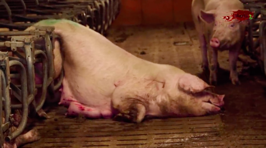 We zien hoe een zeug zichzelf probeert te bevrijden uit de kraamstallen. Ze onderneemt een wanhopige ontsnappingspoging en komt met de heupen vast te zitten tussen de metalen stangen van de kooi waarin ze opgesloten werd.