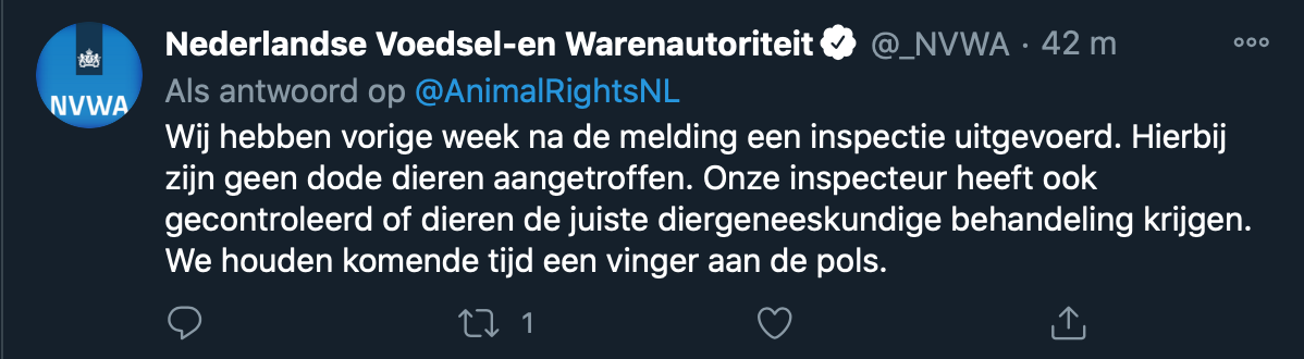 "Wij hebben vorige week na de melding een inspectie uitgevoerd. Hierbij zijn geen dode dieren aangetroffen. Onze inspecteur heeft ook gecontroleerd of dieren de juiste diergeneeskundige behandeling krijgen. We houden komende tijd een vinger aan de pols."