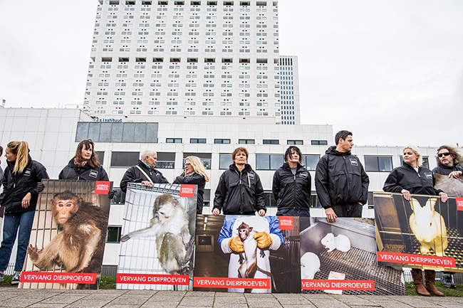 Op zaterdag 18 maart protesteerden zo'n 100 mensen bij het Erasmus MC in Rotterdam. In het grootste proefdiercentrum van Nederland worden jaarlijks meer dan 30.000 dierproeven uitgevoerd op muizen, ratten, konijnen, fretten, zebravissen, vogels, varkens en apen.