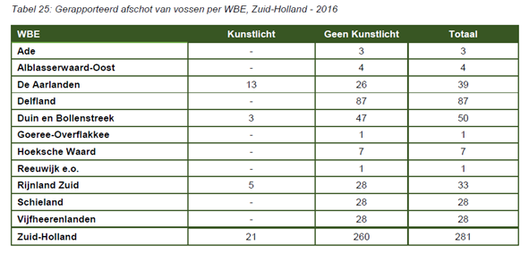 In 2016 zijn er in heel Zuid-Holland 281 vossen afgeschoten. In het jaarverslag van de Faunabeheereenheid wordt aangegeven dat dit naar waarschijnlijkheid slechts een deel van het totaal uitgevoerde afschot betreft.1 Het was namelijk niet verplicht om te rapporteren over het afschot en de vangst die plaats vindt op basis van de landelijke vrijstelling. Het is onbekend hoeveel vossen er in 2017 zijn geschoten. Animal Rights heeft de afschotcijfers opgevraagd.